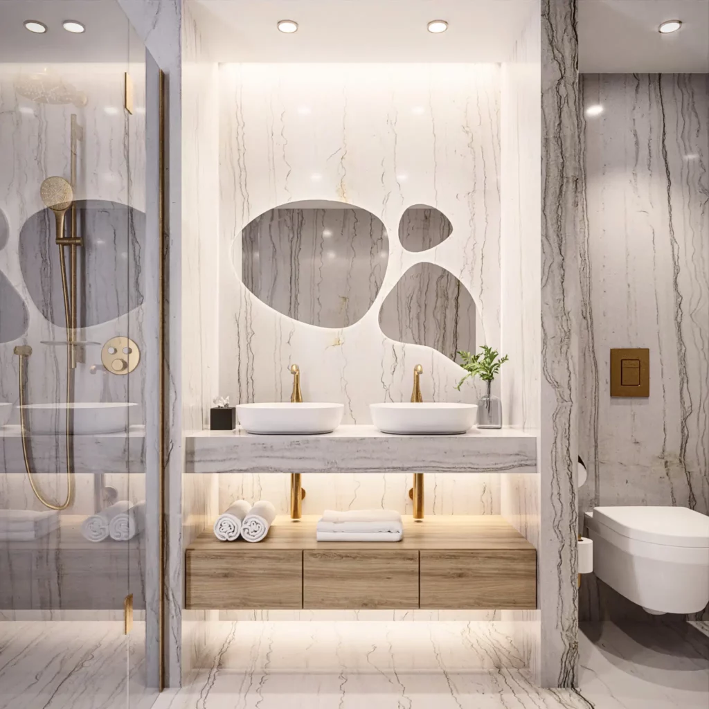 Prezentuje się to niezwykle atrakcyjnie i ozdobnie. Światło subtelnie rozchodzi się i wygląda jak cieniowane. Przy lustrze jest intensywniejsze, im dalej tym staje się bledsze. Niczym świetlna oprawa lustra. Światło wybija je do przodu, a całość nabiera głębi i wyrazistości z efektem trójwymiarowości. Niezależnie od tła – ściana, tapeta, panele, drewno, płytki, gres czy beton – na każdym z nich robi to ogromne wrażenie.